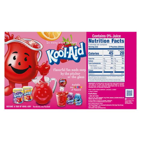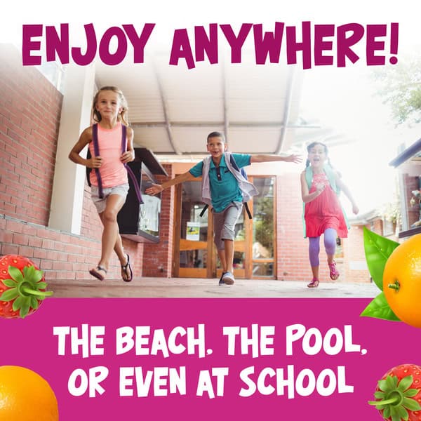 Kool-Aid Jammers Artificially Flavored Strawberry Orange Punch Drink Pouches deliver fun with a sweet blend of strawberry and orange flavors. Our delicious kids drink contains 75% less sugar than leading regular sodas (per 12 fl oz, this product 10g total sugar, leading regular sodas 40g total sugar), making it a great artificially fruit flavored drink for kids. Packed in a convenient drink pouch, kids can enjoy Kool-Aid at home, on the beach or during lunchtime. Each case of artificially flavored strawberry orange Kool Aid Jammers contains 10 pouches. Enjoy flavorful fun made easy. Available in a rainbow of flavors!