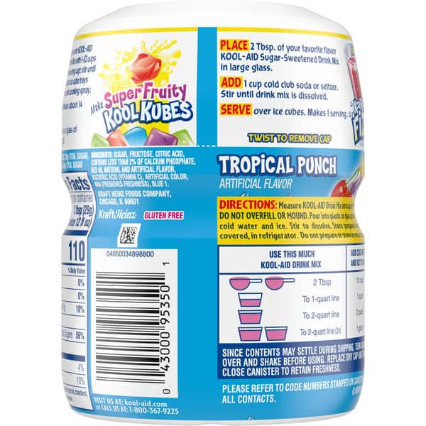 • Tropical punch Kool Aid is packaged in a resealable canister with an easy measure lid and makes up to 8 quarts