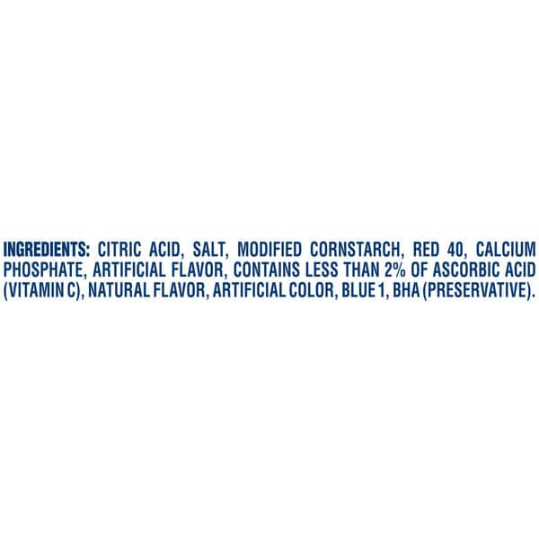 Ingredients: Citric Acid, Salt, Modified Cornstarch, Red 40, Calcium Phosphate, Artificial Flavor, Contains Less Than 2% Of Ascorbic Acid (vitamin C), Natural Flavor, Artificial Color, Blue 1, Bha (preservative).