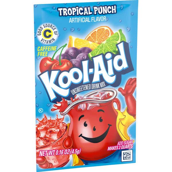 Kool Aid Unsweetened Tropical Punch Powdered Drink Mix is a delicious way to stay hydrated. Our unsweetened drink mix packet makes it easy to prepare a tasty tropical punch drink — just mix it with water and sugar or your sweetener of choice. Quench your thirst with the refreshingly sweet taste of tropical punch. With no caffeine, our powdered drink mix is always a great choice for the whole family. It’s also a good source of vitamin C. Our handy packs of unsweetened tropical punch drink ensure that you always have a refreshing beverage ready to go. To prepare, empty contents of the 0.16 ounce packet into a plastic or glass pitcher. Add 1 cup of sugar or sweetener. Then, just add ice and water and stir for a 2 quart supply of tasty tropical punch Kool Aid.