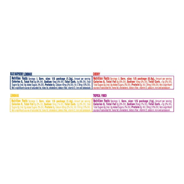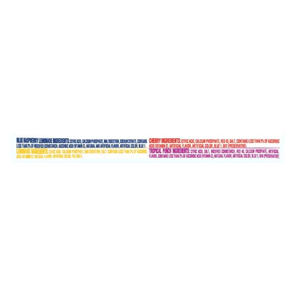 Blue Raspberry Lemonade – Citric Acid, Calcium Phosphate, Maltodextrin, Sodium Citrate, Contains Less Than 2% Of Modified Cornstarch, Ascorbic Acid (vitamin C), Natural And Artificial Flavor, Artificial Color, Blue 1,lemonade – Citric Acid, Calcium Phosphate, Maltodextrin, Salt, Contains Less Than 2% Of Ascorbic Acid (vitamin C), Natural Flavor, Artificial Color, Yellow 5,cherry – Citric Acid, Calcium Phosphate, Red 40, Salt, Contains Less Than 2% Of Ascorbic Acid (vitamin C), Artificial Flavor, Artificial Color, Blue 1, Bht (preservative),tropical Punch – Citric Acid, Salt, Modified Cornstarch, Red 40, Calcium Phosphate, Artificial Flavor, Contains Less Than 2% Of Ascorbic Acid (vitamin C), Natural Flavor, Artificial Color, Blue 1, Bha (preservative)