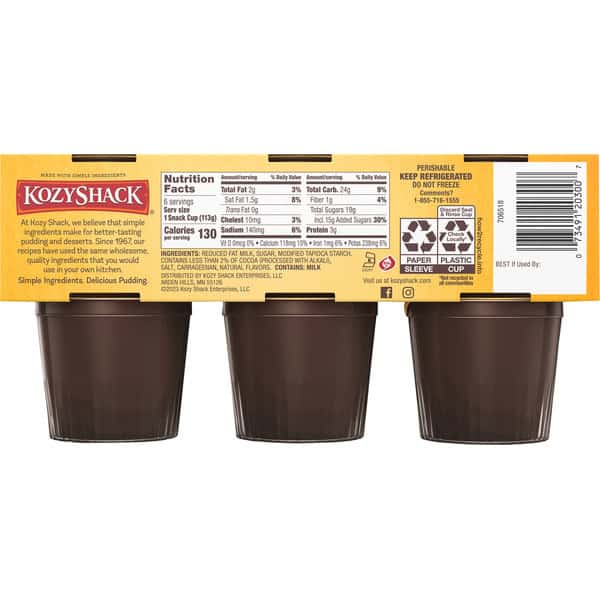 Kozy Shack Chocolate Pudding is more than just a delicious and satisfying snack. It transports you to a place where comfort surrounds you with each delicious bite. Welcome to the most comfortable place imaginable, your Inner Kozy. Escaping to your Kozy place is always just a spoonful away. Enjoy the delicious addition of rich cocoa to our classic, creamy pudding. This a great option for those who don’t like rice or tapioca in their pudding. This pudding is easy to add to your weekly groceries for an afterschool kids’ snack, dessert, or an evening indulgence on the couch. Contains six chocolate pudding snack cups in total.