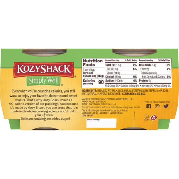 • RICE PUDDING: Kozy Shack Simply Well Rice Pudding is more than just a delicious and satisfying snack; It transports you to a place where comfort surrounds you with each delicious bite