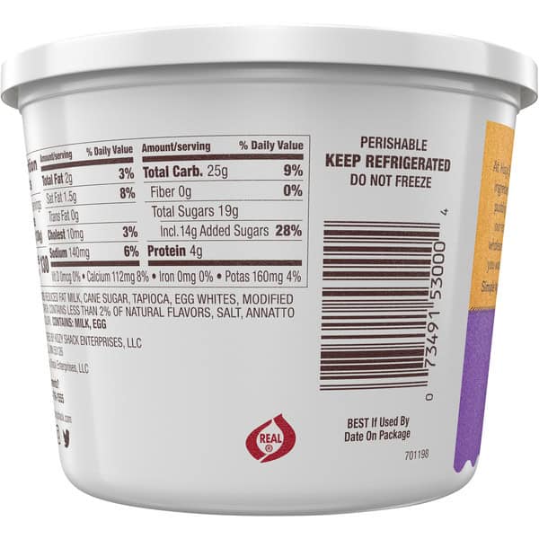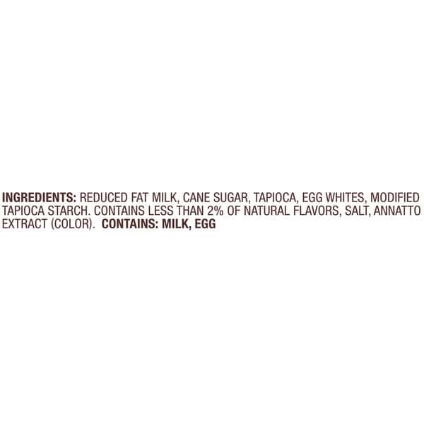 Reduced Fat Milk, Cane Sugar, Tapioca, Egg Whites, Modified Tapioca Starch, Contains Less Than 2% Of Natural Flavors, Salt, Annatto Extract (color)