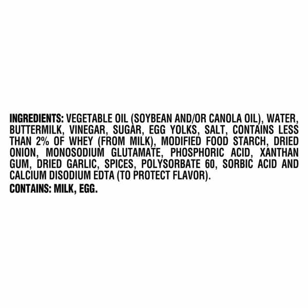 Soybean Oil, Water, Buttermilk, Vinegar, Sugar, Egg Yolks, Salt, Contains Less Than 2% Of Whey (from Milk), Modified Food Starch, Dried Onion, Monosodium Glutamate, Phosphoric Acid, Xanthan Gum, Sorbic Acid And Calcium Disodium Edta (to Protect Flavor), Dried Garlic, Spices, Polysorbate 60