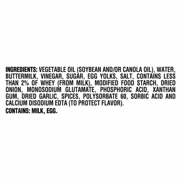 Soybean Oil, Water, Buttermilk, Vinegar, Sugar, Egg Yolks, Salt, Contains Less Than 2% Of Whey (from Milk), Modified Food Starch, Dried Onion, Monosodium Glutamate, Phosphoric Acid, Xanthan Gum, Sorbic Acid And Calcium Disodium Edta (to Protect Flavor), Dried Garlic, Spices, Polysorbate 60