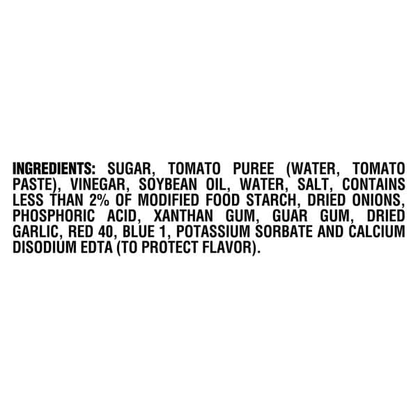 Sugar, Tomato Puree (water, Tomato Paste), Vinegar, Soybean Oil, Water, Salt, Contains Less Than 2% Of Modified Food Starch, Dried Onions Phosphoric Acid, Xanthan Gum, Guar Gum, Dried Garlic, Red 40, Blue 1, Potassium Sorbate And Calcium Disodium Edta (to Protect Flavor).