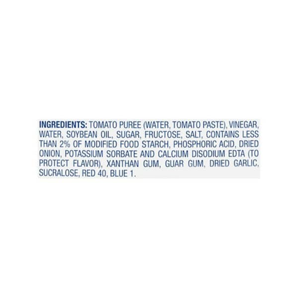 Sugar, Tomato Puree (water, Tomato Paste), Vinegar, Vegetable Oil (soybean And/or Canola Oil), Water, Salt, Contains Less Than 2% Of Modified Food Starch, Dried Onions, Phosphoric Acid, Xanthan Gum, Guar Gum, Dried Garlic, Red 40, Blue 1, Potassium Sorbate And Calcium Disodium Edta (to Protect Flavor).