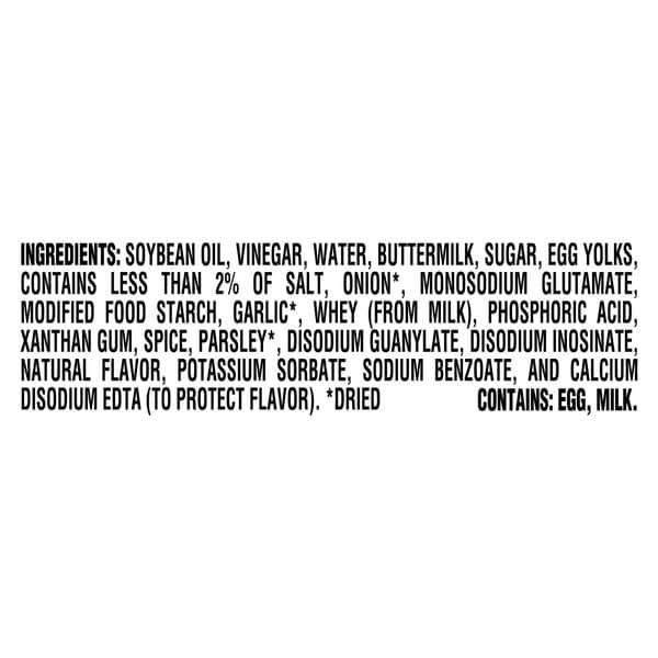 Soybean Oil, Vinegar, Water, Buttermilk, Sugar, Egg Yolks, Contains Less Than 2% Of Salt, Onion*, Monosodium Glutamate, Modified Food Starch, Garlic*, Whey (from Milk), Phosphoric Acid, Xanthan Gum, Spice, Parsley*, Disodium Guanylate, Disodium Inosinate, Natural Flavor, Potassium Sorbate, Sodium Benzoate, And Calcium Disodium Edta (to Protect Flavor).