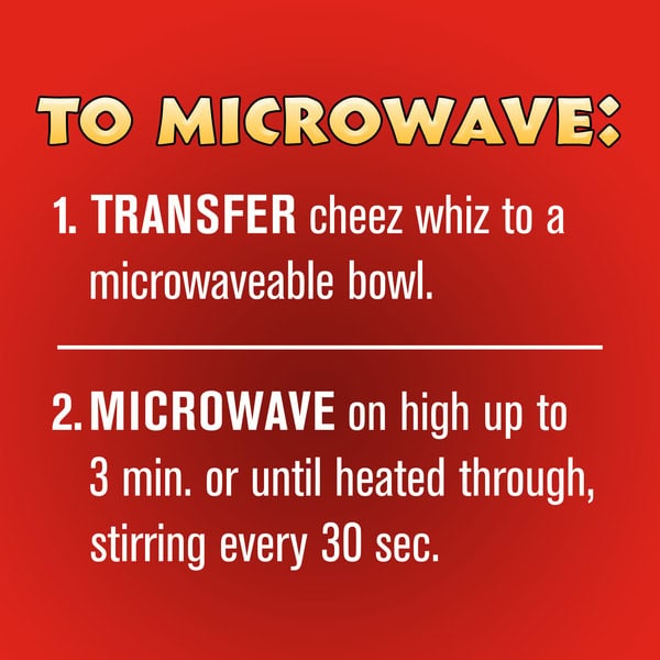 Transfer Cheez Whiz To Microwaveable Bowl. Microwave On High Up To 3 Min. Or Until Heated Through, Stirring Every 30 Sec. (Note: If Heating 1/4 Cup Or Less, Microwave At 15-Sec. Intervals Up To 1 Min.) Cover And Refrigerate Any Remaining Cheez Whiz.