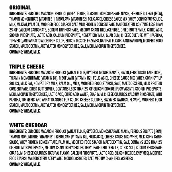 Original: Enriched Macaroni Product (Wheat Flour, Glyceryl Monostearate, Niacin, Ferrous Sulfate [Iron], Thiamin Mononitrate [Vitamin B1], Riboflavin [Vitamin B2], Folic Acid), Cheese Sauce Mix (Whey, Corn Syrup Solids, Milk, Milkfat, Palm Oil, Modified Food Starch, Salt, Milk Protein Concentrate, Maltodextrin, Contains Less Than 2% Of Calcium Carbonate, Sodium Triphosphate, Medium Chain Triglycerides, Dried Buttermilk, Citric Acid, Sodium Phosphate, Lactic Acid, Calcium Phosphate, Nonfat Dry Milk, Guar Gum, Cheese Culture, With Paprika, Turmeric, And Annatto Added For Color, Silicon Dioxide, Enzymes, Natural Flavor, Xanthan Gum), Modified Food Starch, Maltodextrin, Acetylated Monoglycerides, Salt, Medium Chain Triglycerides. Contains: Wheat, Milk. Triple Cheese: Enriched Macaroni Product (Wheat Flour, Glyceryl Monostearate, Niacin, Ferrous Sulfate [Iron], Thiamin Mononitrate [Vitamin B1], Riboflavin [Vitamin B2], Folic Acid), Cheese Sauce Mix (Whey, Corn Syrup Solids, Milk Fat, Nonfat Dry Milk, Palm Oil, Milk, Modified Food Starch, Salt, Maltodextrin, Milk Protein Concentrate, Dried Buttermilk, Contains Less Than 2% Of Silicon Dioxide [Flow Agent], Sodium Phosphate, Medium Chain Triglycerides, Lactic Acid, Citric Acid, Water, Guar Gum, Cheese Cultures, Calcium Phosphate, With Paprika, Turmeric, And Annatto Added For Color, Cheese Culture, Enzymes, Natural Flavor), Modified Food Starch, Maltodextrin, Acetylated Monoglycerides, Salt, Medium Chain Triglycerides. Contains: Wheat, Milk.