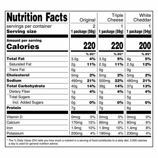 • Contains two 2.05 oz Original cups, one 2.05 oz Triple Cheese cup and one 1.9 oz White Cheddar cup