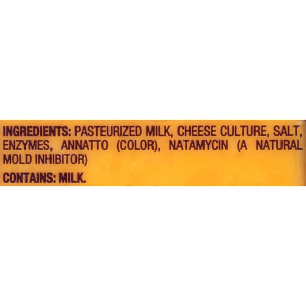 Pasteurized Milk, Cheese Culture, Salt, Enzymes, Annatto (color), Natamycin (a Natural Mold Inhibitor)