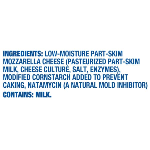 Low Moisture Part-skim Mozzarella Cheese (pasteurized Part-skim Milk, Cheese Culture, Salt, Enzymes), Modified Cornstarch Added To Prevent Caking, Natamycin (a Natural Mold Inhibitor)