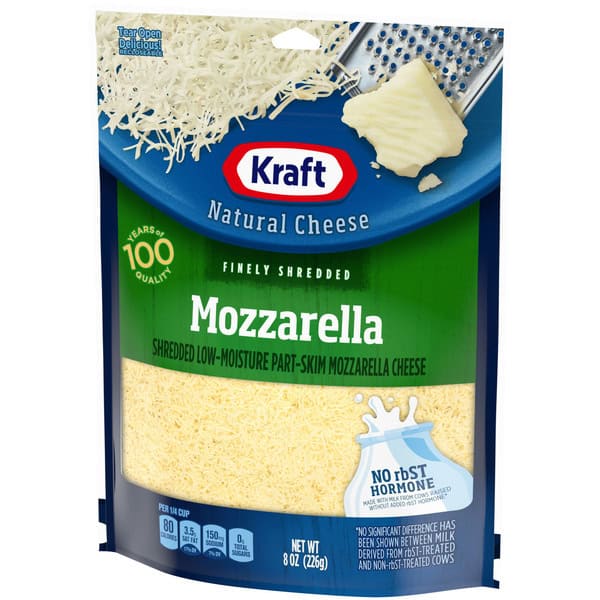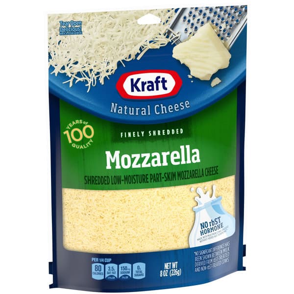 Mealtime can be hard, especially when it comes to making something everyone agrees on. Use Kraft Finely Shredded Natural Mozzarella Shredded Cheese to make something everyone will love, so you can spend time focused on each other and not worried about making everyone happy. Finely shredded low-moisture and part-skim mozzarella shredded cheese brings a special touch to your Italian recipes with the Kraft flavor you know and love. Backed by 100 years of quality, this Mozzarella cheese taste great on a variety of dishes that the whole family will love. This cheese comes pre-shredded to save you prep time and easily blends with other flavors for a delicious meal every time. Sprinkle over pizzas, pasta dishes, salads, and more. Each 8 ounce bag of shredded cheese is resealable to help lock in flavor. Made with milk from cows raised without added rbST hormone. No significant difference has been shown between milk derived from rbST-treated and non-rbST treated cows.