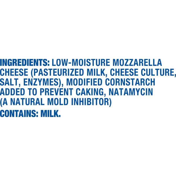 Low-moisture Mozzarella Cheese (pasteurized Milk, Cheese Culture, Salt, Enzymes), Modified Cornstarch Added To Prevent Caking, Natamycin (a Natural Mold Inhibitor)