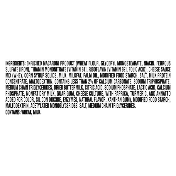 Enriched Macaroni Product (wheat Flour, Glyceryl Monostearate, Niacin, Ferrous Sulfate [iron], Thiamin Mononitrate [vitamin B1], Riboflavin [vitamin B2], Folic Acid); Cheese Sauce Mix (whey, Milk, Corn Syrup Solids, Milkfat, Palm Oil, Modified Food Starch, Milk Protein Concentrate, Salt, Maltodextrin, Contains Less Than 2% Of Calcium Carbonate, Sodium Triphosphate, Medium Chain Triglycerides, Dried Buttermilk, Sodium Phosphate, Citric Acid, Cream, Lactic Acid, Calcium Phosphate, Cheese Culture, Nonfat Dry Milk, Guar Gum, With Paprika, Turmeric, And Annatto Added For Color, Enzymes, Natural Flavor, Xanthan Gum); Modified Food Starch, Maltodextrin, Potassium Chloride, Acetylated Monoglycerides, Salt, Medium Chain Triglycerides.