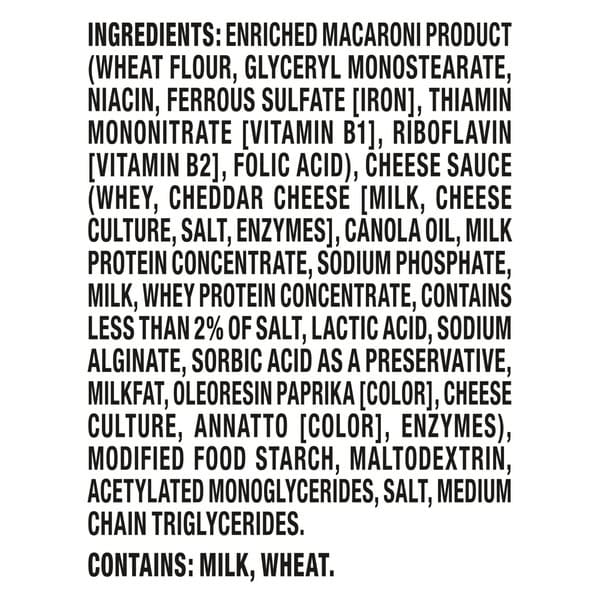 Enriched Macaroni Product (wheat Flour, Glyceryl Monostearate, Niacin, Ferrous Sulfate [iron], Thiamin Mononitrate [vitamin B1], Riboflavin [vitamin B2], Folic Acid), Cheese Sauce (whey, Cheddar Cheese [milk, Cheese Culture, Salt, Enzymes], Canola Oil, Milk Protein Concentrate, Sodium Phosphate, Milk, Whey Protein Concentrate, Contains Less Than 2% Of Salt, Lactic Acid, Sodium Alginate, Sorbic Acid As A Preservative, Milkfat, Oleoresin Paprika [color], Cheese Culture, Annatto [color], Enzymes), Modified Food Starch, Maltodextrin, Acetylated Monoglycerides, Salt, Medium Chain Triglycerides