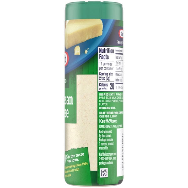 Kraft Grated Parmesan Cheese enhances your pastas, pizzas, seafood, salads and more with the bold taste of Kraft grated cheese. The sharp and tangy flavor complements your favorite recipes, and its pre-grated to save you valuable prep time in the kitchen. This cheese is sure to add great nutty and salty flavor to your favorite meals at any occasion. Sprinkle this Parmesan cheese over pasta dishes or add it your signature chicken Parmesan recipe for extra flavor. Kraft Parmesan Cheese comes in a convenient shaker bottle for ease of use and convenient storage. After opening, store cheese in the refrigerator., ● One 3 oz bottle of Kraft Grated Parmesan Cheese, ● Kraft Grated Parmesan Cheese is made with premium quality milk, ● Delivers sharp, tangy flavor to your favorite recipes, ● Grated for convenience, ● Versatile Italian style Parmesan cheese enhances your pastas, pizzas, seafood, salads and more, ● Shaker bottle is easy to use and store, ● Refrigerate after opening