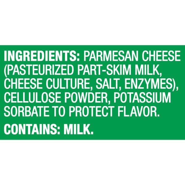 Parmesan Cheese (pasteurized Part-skim Milk, Cheese Culture, Salt, Enzymes), Cellulose Powder, Potassium Sorbate To Protect Flavor.