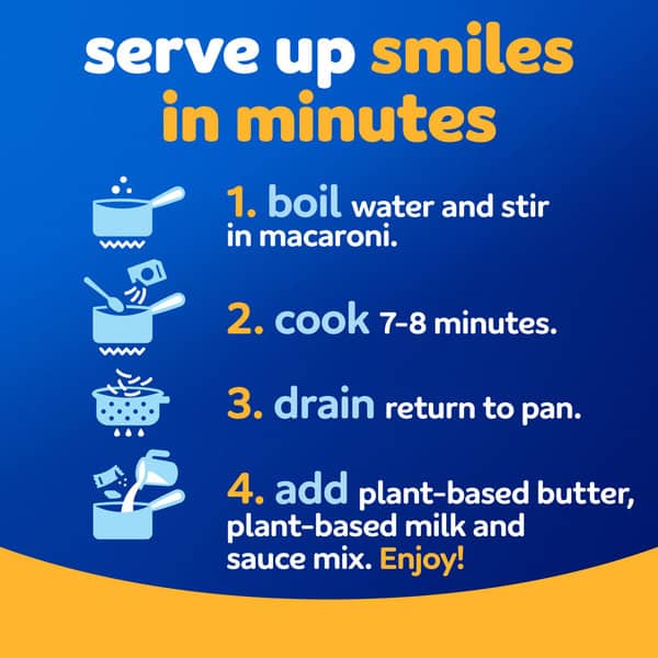 • To prepare, boil 6 cups of water, stir in macaroni, cook 7-8 minutes, drain the water, then add 4 tbsp plant-based butter, 1/4 cup unsweetened original plant-based milk and sauce mix; mix well