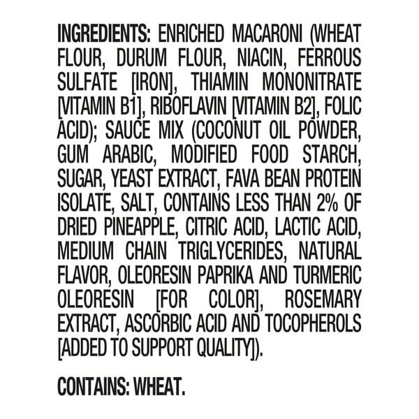 Enriched Macaroni (wheat Flour, Durum Flour, Niacin, Ferrous Sulfate [iron], Thiamin Mononitrate [vitamin B1], Riboflavin [vitamin B2], Folic Acid), Sauce Mix (coconut Oil Powder, Gum Arabic, Modified Food Starch, Sugar, Yeast Extract, Fava Bean Protein Isolate, Salt, Contains Less Than 2% Of Dried Pineapple, Citric Acid, Lactic Acid, Medium Chain Triglycerides, Natural Flavor, Oleoresin Paprika And Turmeric Oleoresin [for Color], Rosemary Extract, Ascorbic Acid And Tocopherols [added To Support Quality])