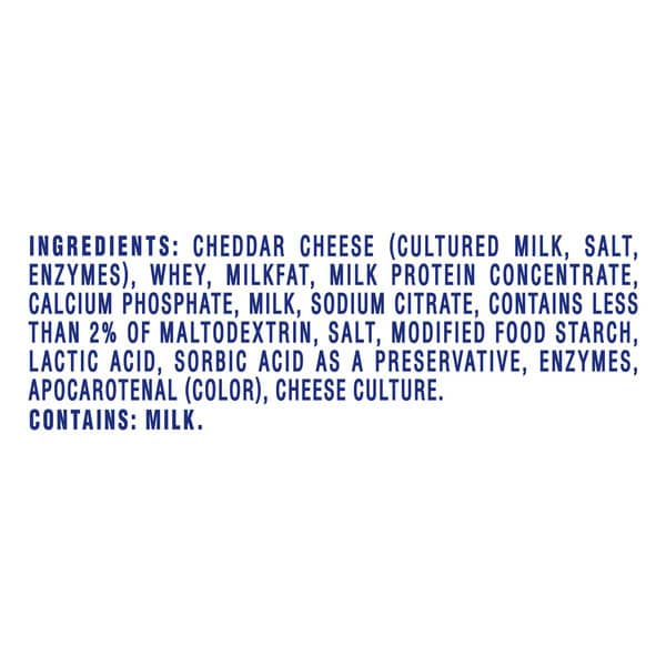 Cheddar Cheese (cultured Milk, Salt, Enzymes), Whey, Milkfat, Milk Protein Concentrate, Calcium Phosphate, Milk, Sodium Citrate, Contains Less Than 2% Of Maltodextrin, Salt, Modified Food Starch, Lactic Acid, Sorbic Acid As A Preservative, Cheese Culture, Apocarotenal (color), Enzymes.