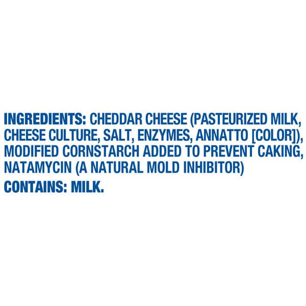 Cheddar Cheese (pasteurized Milk, Cheese Culture, Salt, Enzymes, Annatto [color]), Modified Cornstarch Added To Prevent Caking, Natamycin (a Natural Mold Inhibitor)