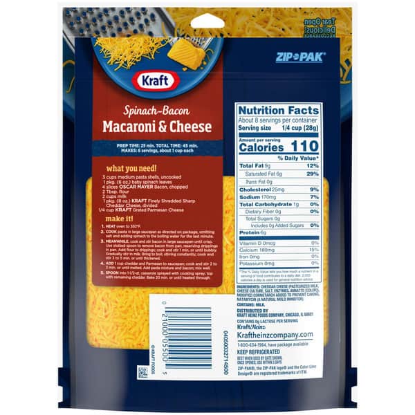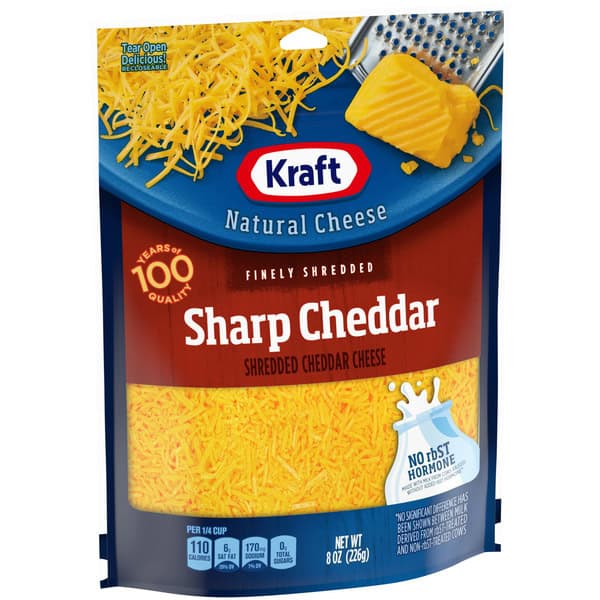 Mealtime can be hard, especially when it comes to making something everyone agrees on. Use Kraft Finely Shredded Natural Sharp Cheddar Shredded Cheese to make something everyone will love, so you can spend time focused on each other and not worried about making everyone happy. This shredded cheddar cheese comes backed by a brand with more than 100 years of cheese making experience. This Kraft Natural Cheese has a rich, creamy flavor guaranteed to enhance your family’s favorite dishes. This easy to melt cheese comes pre-shredded, so it sprinkles evenly over any dish to add gooey goodness. Layer this finely shredded cheese in casseroles, sprinkle it over salads, use it on homemade pizzas or to make ordinary pasta dishes extraordinary. Each 8 ounce bag of cheese is resealable to help lock in flavor. Made with milk from cows raised without added rbST hormone. No significant difference has been shown between milk derived from rbST-treated and non-rbST treated cows.