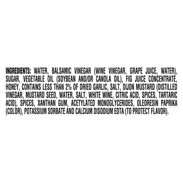 Water, Balsamic Vinegar (wine Vinegar, Grape Juice, Water), Sugar, Vegetable Oil (soybean And/or Canola Oil), Fig Juice Concentrate, Honey, Contains Less Than 2% Of Dried Garlic, Salt, Dijon Mustard (distilled Vinegar, Mustard Seed, Water, Salt, White Wine, Citric Acid, Spices, Tartaric Acid), Spices, Xanthan Gum, Acetylated Monoglycerides, Oleoresin Paprika (color), Potassium Sorbate And Calcium Disodium Edta (to Protect Flavor).