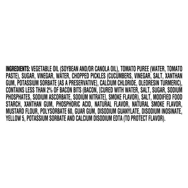 Soybean Oil, Tomato Puree (water, Tomato Paste), Sugar, Vinegar, Water, Chopped Pickles (cucumbers, Vinegar, Salt, Xanthan Gum, Potassium Sorbate [as A Preservative], Calcium Chloride, Oleoresin Turmeric), Contains Less Than 2% Of Bacon Bits (bacon [cured With Water, Salt, Sugar, Sodium Phosphates, Sodium Ascorbate, Sodium Nitrite], Smoke Flavor), Salt, Modified Food Starch, Xanthan Gum, Natural Flavor, Phosphoric Acid, Mustard Flour, Polysorbate 60, Guar Gum, Disodium Guanylate, Disodiun Inosinate, Yellow 5, Potassium Sorbate And Calcium Disodium Edta (to Protect Flavor).