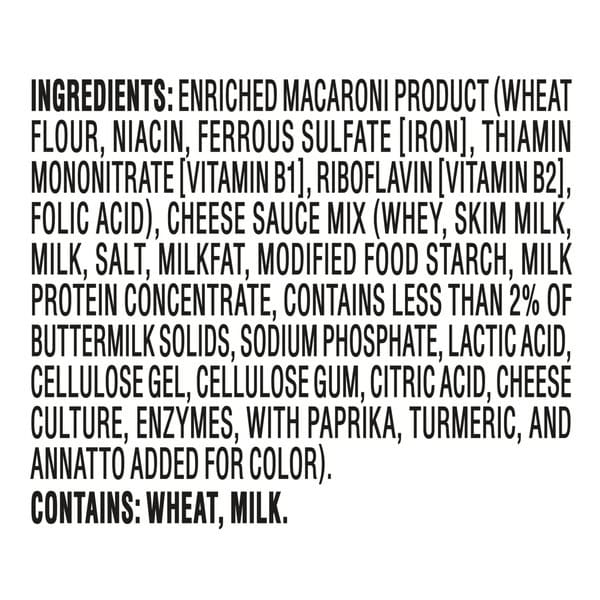 Enriched Macaroni Product (wheat Flour, Niacin, Ferrous Sulfate [iron], Thiamin Mononitrate [vitamin B1], Riboflavin [vitamin B2], Folic Acid), Cheese Sauce Mix (whey, Skim Milk, Milk, Salt, Milkfat, Modified Food Starch, Milk Protein Concentrate, Contains Less Than 2% Of Buttermilk Solids, Sodium Phosphate, Lactic Acid, Cellulose Gel, Cellulose Gum, Citric Acid, Cheese Culture, Enzymes, With Paprika, Turmeric, And Annatto Added For Color)