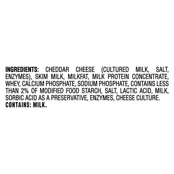 Milk, Cheddar Cheese (milk, Cheese Culture, Salt, Enzymes), Whey, Milk Protein Concentrate, Milkfat, Sodium Citrate, Contain Less Than 2% Of Calcium Phosphate, Modified Food Starch, Whey Protein Concentrate, Salt, Lactic Acid, Natamycin (a Natural Mold Inhibitor), Enzymes, Cheese Culture, Vitamin D3.