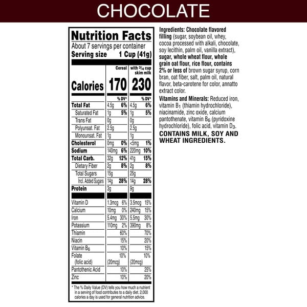 Chocolate Flavored Filling (sugar, Soybean Oil, Whey, Cocoa Processed With Alkali, Chocolate, Soy Lecithin, Palm Oil, Vanilla Extract), Sugar, Whole Wheat Flour, Whole Grain Oat Flour, Rice Flour, Contains 2% Or Less Of Brown Sugar Syrup, Corn Bran, Oat Fiber, Salt, Palm Oil, Natural Flavor, Beta-carotene For Color, Annatto Extract Color, Vitamins And Minerals: Reduced Iron, Vitamin B₁ (thiamin Hydrochloride), Niacinamide, Zinc Oxide, Calcium Pantothenate, Vitamin B₆ (pyridoxine Hydrochloride), Folic Acid, Vitamin D₃