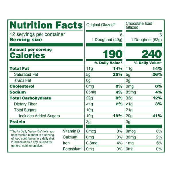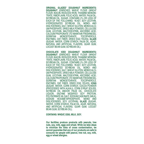 Original Glazed Doughnut: Doughnut (Enriched Wheat Flour (Wheat Flour, Niacin, Reduced Iron, Thiamine Mononitrate, Riboflavin, Folic Acid), Water, Palm Oil, Soybean Oil, Sugar, Contains 2% or Less of Each of the Following: Yeast, Soy Lecithin, Hydrogenated Soybean Oil, Mono- and Diglycerides, Salt, Wheat Gluten, Monocalcium Phosphate, Dried Milk Powder, Cellulose Gum, Lecithin, Maltodextrin, Ascorbic Acid, Calcium Propionate (to Maintain Freshness), Sorbitan Monostearate, Tocopherols, Enzymes, Oat Fiber, Dried Egg Yolks), Glaze (Sugar, Water, Corn Starch, Palm Oil, Agar, Natural and Artificial Flavors, Guar Gum, Locust Bean Gum, Soybean Oil). Chocolate Iced Doughnut: Doughnut (Enriched Wheat Flour (Wheat Flour, Niacin, Reduced Iron, Thiamine Mononitrate, Riboflavin, Folic Acid), Water, Palm Oil, Soybean Oil, Sugar, Contains 2% or Less of Each of the Following: Yeast, Soy Lecithin, Hydrogenated Soybean Oil, Mono- and Diglycerides, Salt, Wheat Gluten, Monocalcium Phosphate, Dried Milk Powder, Cellulose Gum, Lecithin, Maltodextrin, Ascorbic Acid, Calcium Propionate (to Maintain Freshness), Sorbitan Monostearate, Tocopherols, Enzymes, Oat Fiber, Dried Egg Yolks), Icing (Sugar, Water, Corn Starch, Cocoa Powder (Processed with Alkali), Corn Syrup Solids, Soybean Oil and/or Palm Oil, Chocolate Liquor, Enzyme Modified Soy Protein, Polysorbate 60, Salt, Sodium Caseinate (Milk), Sodium Hexametaphosphate, Mono and Diglycerides, Soy Lecithin), Glaze (Sugar, Water, Corn Starch, Palm Oil, Agar, Natural and Artificial Flavors, Guar Gum, Locust Bean Gum, Soybean Oil).