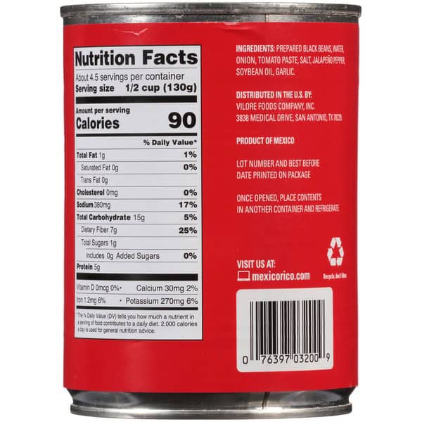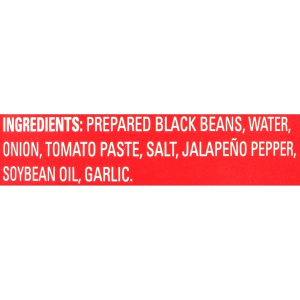 Prepared Black Beans, Water, Onion, Tomato Paste, Salt, Jalapeno Pepper, Soybean Oil, Garlic.