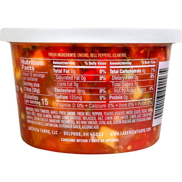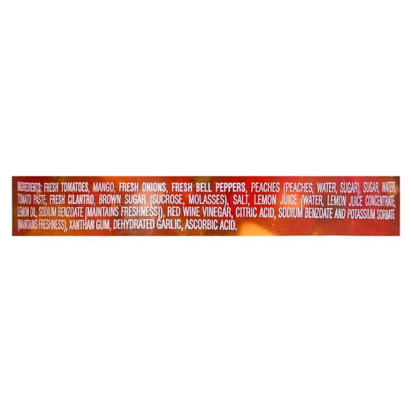 Fresh Tomatoes, Fresh Frozen Mangos, Fresh Onions, Fresh Bell Peppers, Tomato Puree (tomato Concentrate [water, Tomato Paste], Citric Acid), Peaches (peaches, Water, Corn Syrup, Sugar), Sugar, Fresh Cilantro, Brown Sugar, Salt, Red Wine Vinegar (red Wine Vinegar, Potassium Metabisulfite [to Help Protect Flavor], Water), Lemon Juice (water, Lemon Juice Concentrate, Lemon Oil, Sodium Benzoate [to Help Protect Flavor], Citric Acid, Sodium Benzoate (to Help Protect Flavor), Potassium Sorbate (to Help Protect Flavor), Garlic, Xanthan Gum, Ascorbic Acid