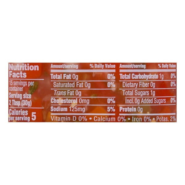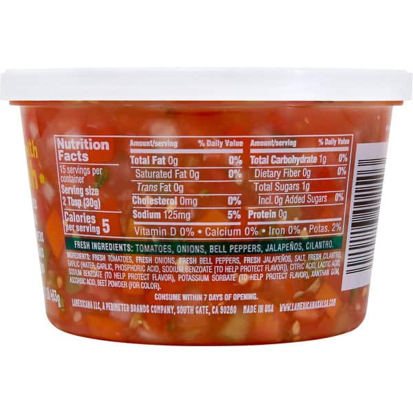 Fresh Diced Tomatoes, Fresh Chopped Assorted Peppers, Fresh Diced Onions, Fresh Chopped Cilantro, Salt, Crushed Garlic, Assorted Spices, Citric Acid, Sodium Metabisulfite, Ascorbic Acid, Potassium Sorbate, Sodium Benzoate (to Maintain Freshness).