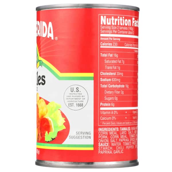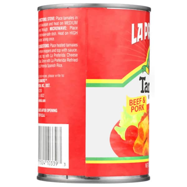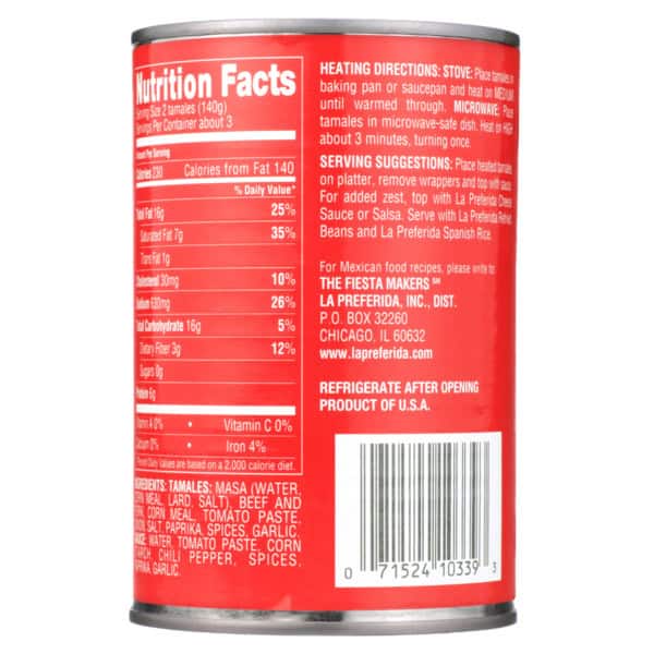 Heating: Stove: Place tamales in baking pan or saucepan and heat on medium until warmed through. Microwave: Place tamales in microwave-safe dish. Heat on high about 3 minutes, turning once. Refrigerate after opening. Serving Suggestions: Place heated tamales on platter, remove wrappers and top with sauce. For added zest, top with La Preferida cheese sauce or salsa. Serve with La Preferida refried beans and La Preferida Spanish rice.