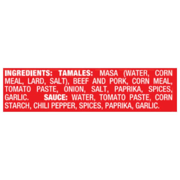 TAMALES: masa (water, cornmeal, lard, salt), beef and pork, cornmeal, tomato paste, onion, salt, paprika, spices, garlic.