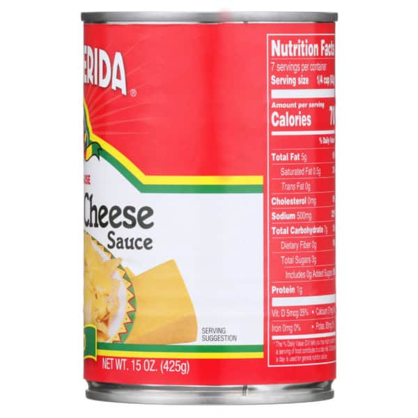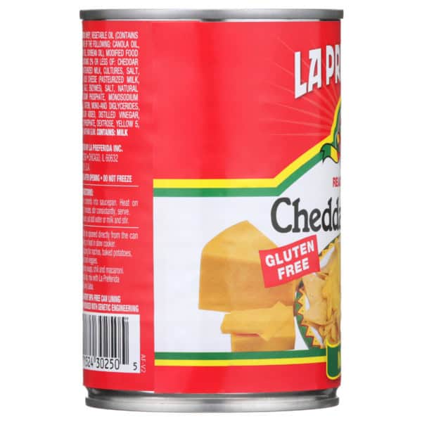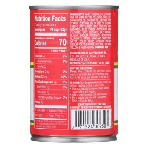Refrigerate after opening. Do not freeze. Heating Directions: Stove: Pour contents into saucepan. Heat on medium for 2 minutes, stir consistantly, serve. For a lighter sauce, just add water or milk and stir. To Serve: May be spooned directly from the can without heating; or heat in slow cooker. Use as a topping for nachos, baked potatoes, potato skins and veggies. Add to creamy soups, chili and macaroni. For a special dip, mix with La Preferida Thick ‘n Chunky Salsa.