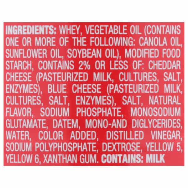 whey, vegetable oil contains one or more of the following: canola oil, sunflower oil, soybean oil), modified food starch, contains 2% or less of: cheddar cheese (pasteurized milk, cultures, salt, enzymes), blue cheese(pasteurized milk cultures, salt, enzymes), salt, natural flavor, sodium phosphate, monosodium glutamate, datem, mono-and diglycerides, water, color added, distilled vinegar, sodium polyphosphate, dextrose, yellow 5, yellow 6, xanthan gum. Contains: milk