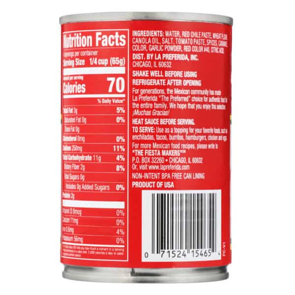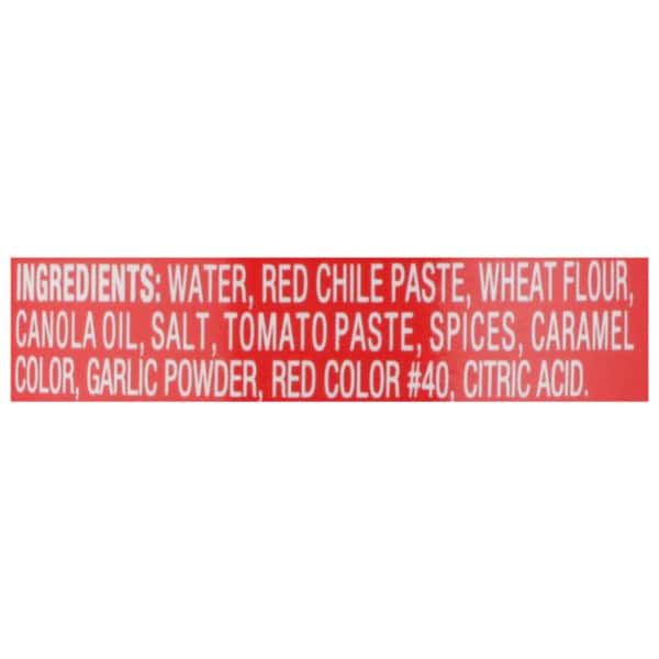Water, Red Chile Paste, Wheat Flour, Canola Oil, Salt, Tomato Paste, Spices, Caramel Color, Garlic Powder, Red Color #40, Citric Acid.