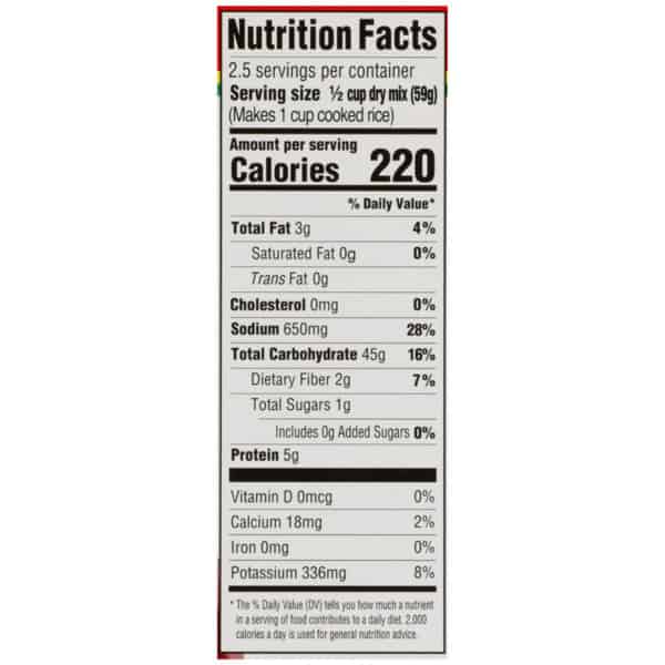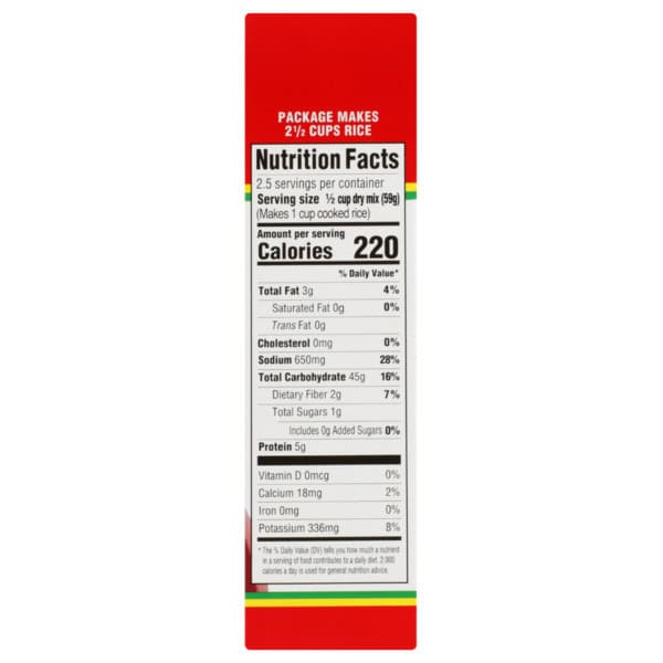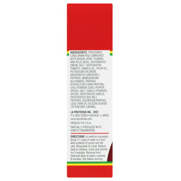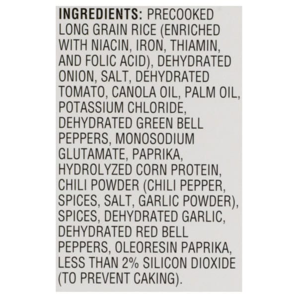 Precooked Long Grain Rice (enriched With Niacin, Iron, Thiamin, And Folic Acid), Dehydrated Onion, Salt, Dehydrated Tomato, Canola Oil, Palm Oil, Potassium Chloride, Dehydrated Green Bell Peppers, Monosodium Glutamate, Paprika, Hydrolyzed Corn Protein, Chili Powder (chili Pepper, Spices, Salt, Garlic Powder), Spices, Dehydrated Garlic, Dehydrated Red Bell Peppers, Oleoresin Paprika, Less Than 2% Silicon Dioxide (to Prevent Caking).