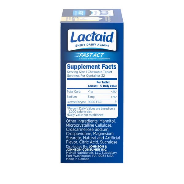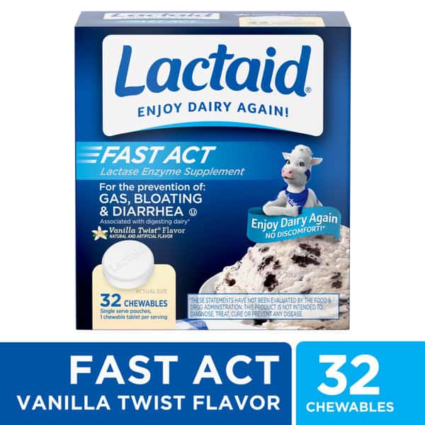 Lactaid Fast Act Chewables with natural lactase enzyme come in a Vanilla Twist flavor and work quickly to make dairy foods easy to digest for those with lactose intolerance or dairy sensitivity, so you can enjoy everything on your plate. This digestive supplement helps prevent the gas, bloating, and diarrhea that many people experience after eating foods containing dairy. The lactase enzymes in this dietary supplement contain 9000 FCC lactase units to help prevent symptoms associated with lactose intolerance by breaking down milk sugar (lactose), so dairy foods are easier to digest. These tasty chewables feature a smooth Vanilla Twist flavor and start working with your first bite or sip of dairy food. Certified kosher and suitable for ages 4 and up, Lactaid Fast Act Chewables are available in convenient, individually-wrapped packs making them easily portable for on-the-go dairy relief anywhere, anytime.