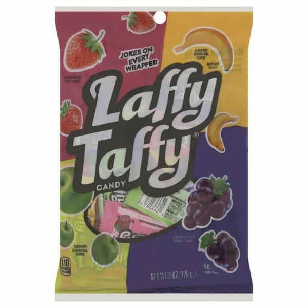Strawberry. Banana. Sour apple. Grape. Flavor with other natural flavors. 100 calories per 3 bars. Jokes on every wrapper. laffytaffy.com. Get in touch 1-800-358-1971; laffytaffy.com. Made in the USA with globally sourced ingredients.