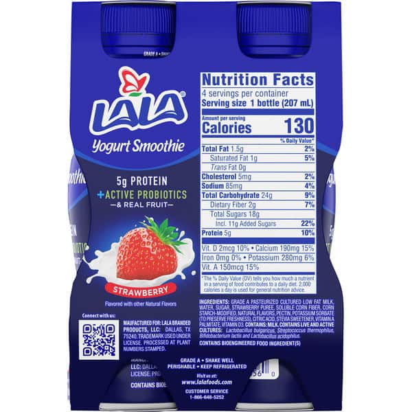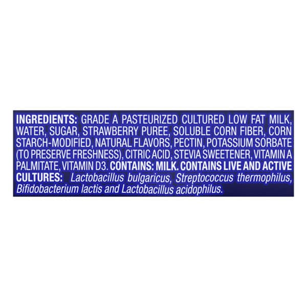 Grade A Pasteurized Cultured Low Fat Milk, Water, Sugar, Strawberry Puree, Soluble Corn Fiber, Corn Starch-modified, Natural Flavors, Pectin, Potassium Sorbate (to Preserve Freshness), Citric Acid, Stevia Leaf Extract, Vitamin A Palmitate, Vitamin D3.
