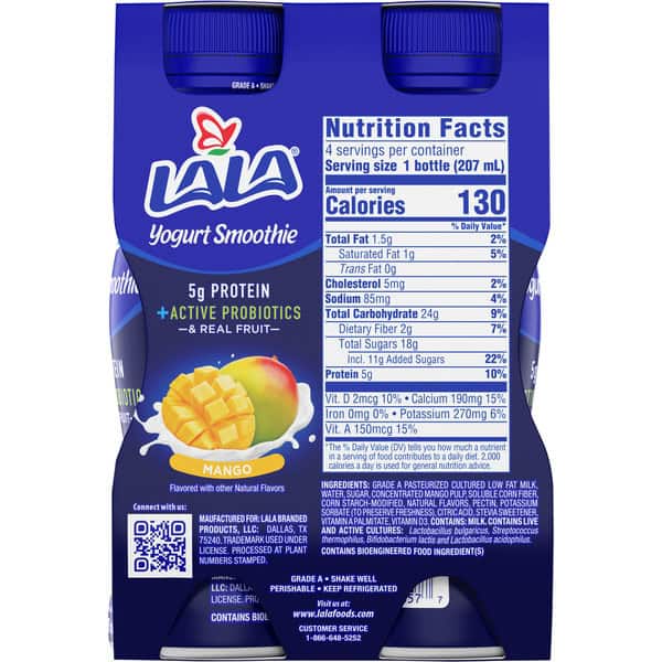 Grade A Pasteurized Cultured Low Fat Milk, Water, Sugar, Concentrated Mango Pulp, Soluble Corn Fiber, Corn Starch-modified, Natural Flavors, Pectin, Potassium Sorbate (to Preserve Freshness), Citric Acid, Stevia Leaf Extract, Vitamin A Palmitate, Vitamin D3.