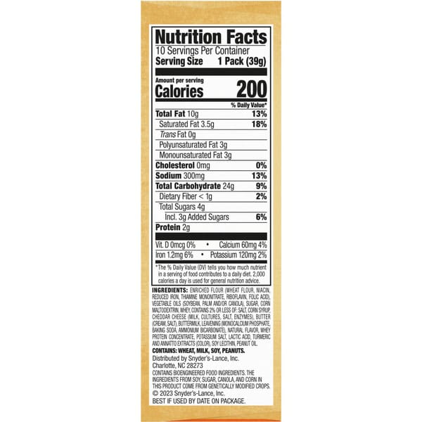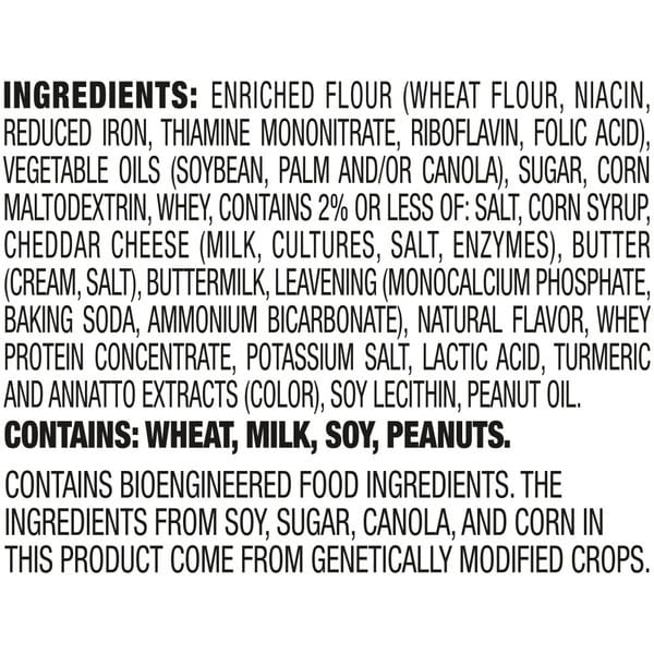 Enriched Flour (wheat Flour, Niacin, Reduced Iron, Thiamine Mononitrate, Riboflavin, Folic Acid), Vegetable Oils (soybean, Palm And/or Canola), Sugar, Corn Maltodextrin, Whey, Contains 2% Or Less Of: Salt, Corn Syrup, Cheddar Cheese (milk, Cultures, Salt, Enzymes), Butter (cream, Salt), Buttermilk, Leavening (monocalcium Phosphate, Baking Soda, Ammonium Bicarbonate), Natural Flavor, Whey Protein Concentrate, Potassium Salt, Lactic Acid, Turmeric And Annatto Extracts (color), Soy Lecithin, Peanut Oil