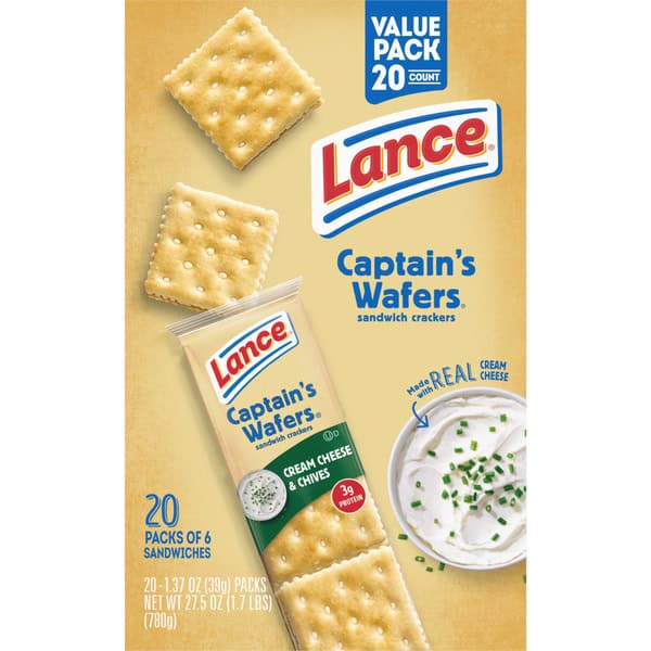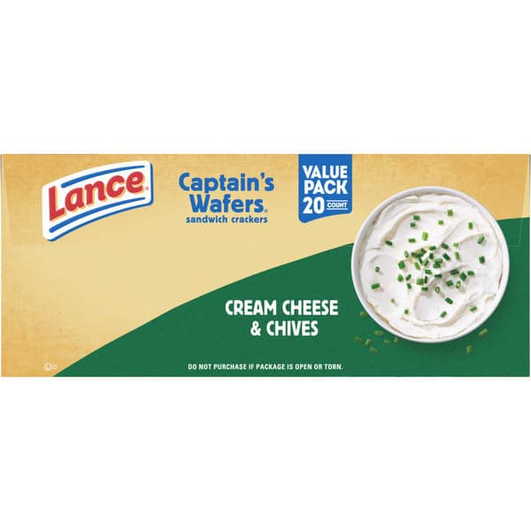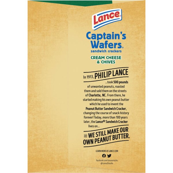 Get a delicious, full-flavored bite whenever the craving strikes. Lance Captain’s Wafers Cream Cheese and Chives filled Sandwich Crackers make a wonderful savory snack. They feature a delicious blend of ingredients, including real cream cheese, that delivers the full, rich flavor you want paired with the tang of chive. At Lance, sandwiches mean more: they aren’t just two somethings with whatever in the middle. A Lance sandwich is two awesomes with totally incredible in the middle — and we’ve made them that way for over 100 years. Of course, Lance Captain’s Wafers Cream Cheese and Chive filled Sandwich Crackers are no different. Because every sandwich cracker means more, they’re made to taste incredible. These Captain’s Wafers crackers come in a convenient 20-count package with 6 sandwich crackers per pack, making them ideal for lunch boxes or your on-the-go bags. So, the next time you’re ready to take a moment or need a quick pick-me-up, make it your one and only Lance sandwich crackers, the king of all sandwich crackers. Bring it!